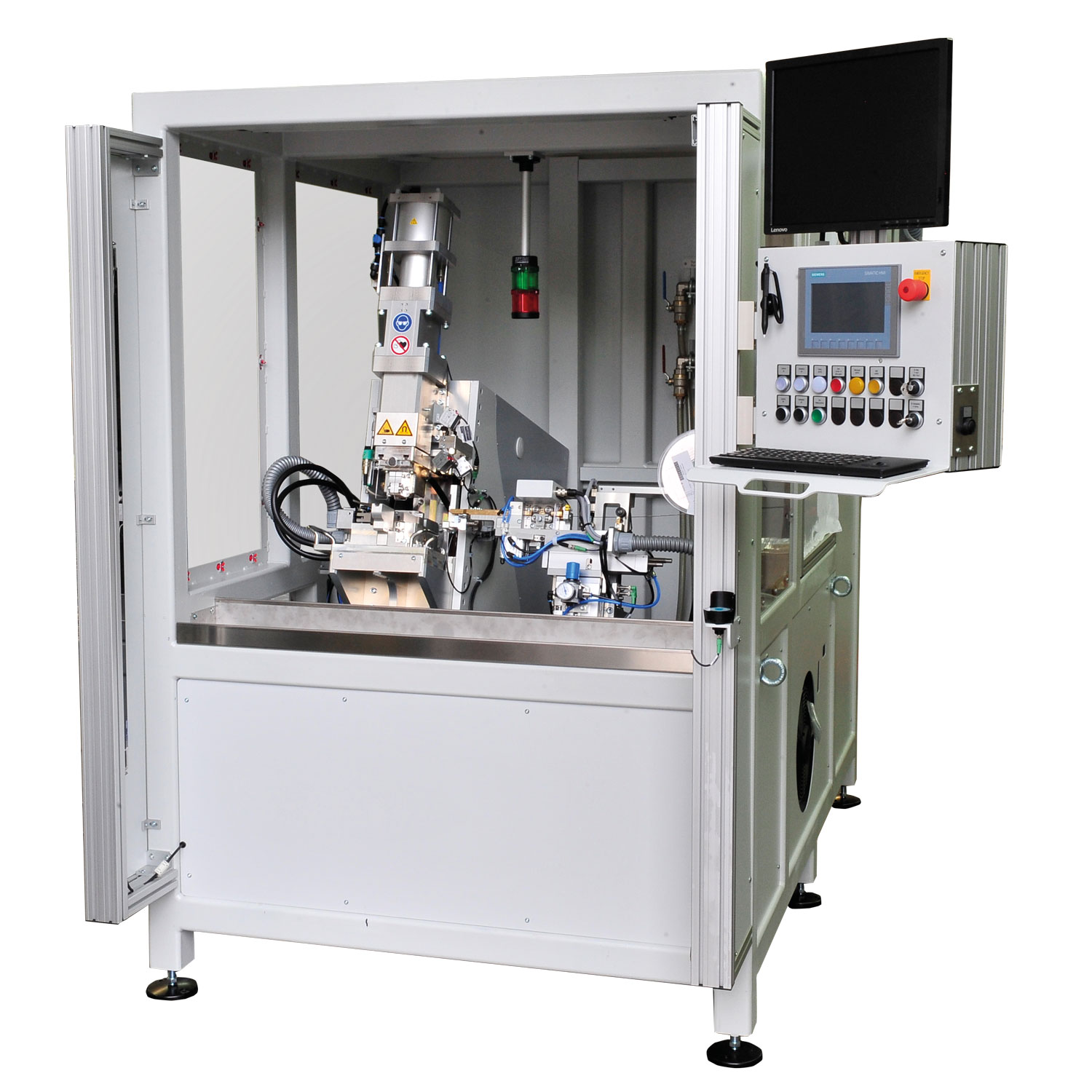 Manuelle Schweißzelle mit automatischer STRUNK SERVO Hartlotzufuhr für die ALL IN ONE SHOT Lösung, d.h. Kompaktierschweißen unter Hartlot in einem Zug. Die Leitung wird unter Zufuhr von Hartlot (STRUNK automatische SERVO Zuführung) auf den Kontakt kompaktiert und geschweißt.