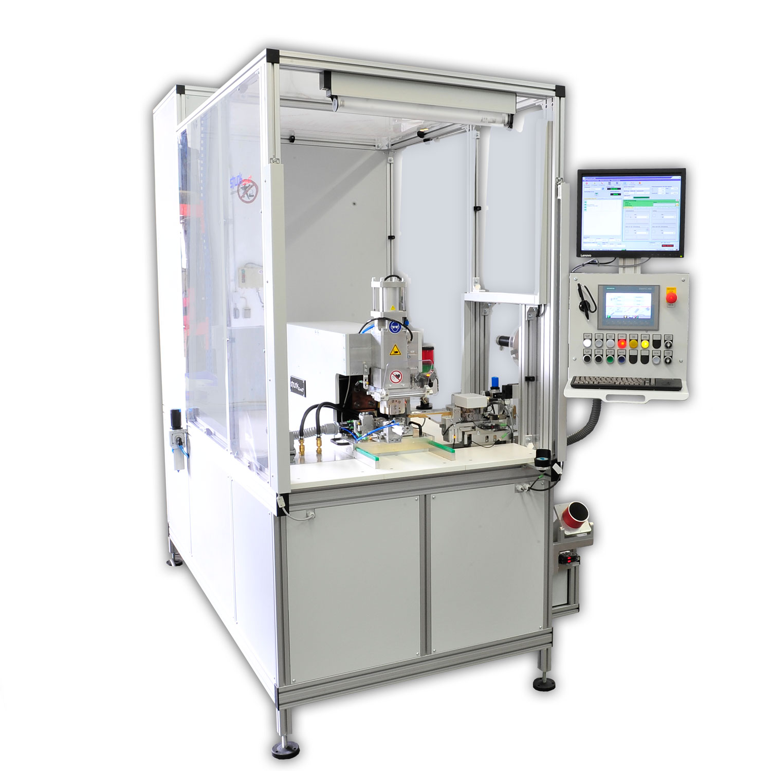 Automatic system with 4 servo-controlled axes and tool changing system for different products. The system includes a STRUNK 1,000 Hz medium frequency welding gun and the STRUNK SERVO brazing solder feeder for precise positioning of the solder pad on the BusBar.