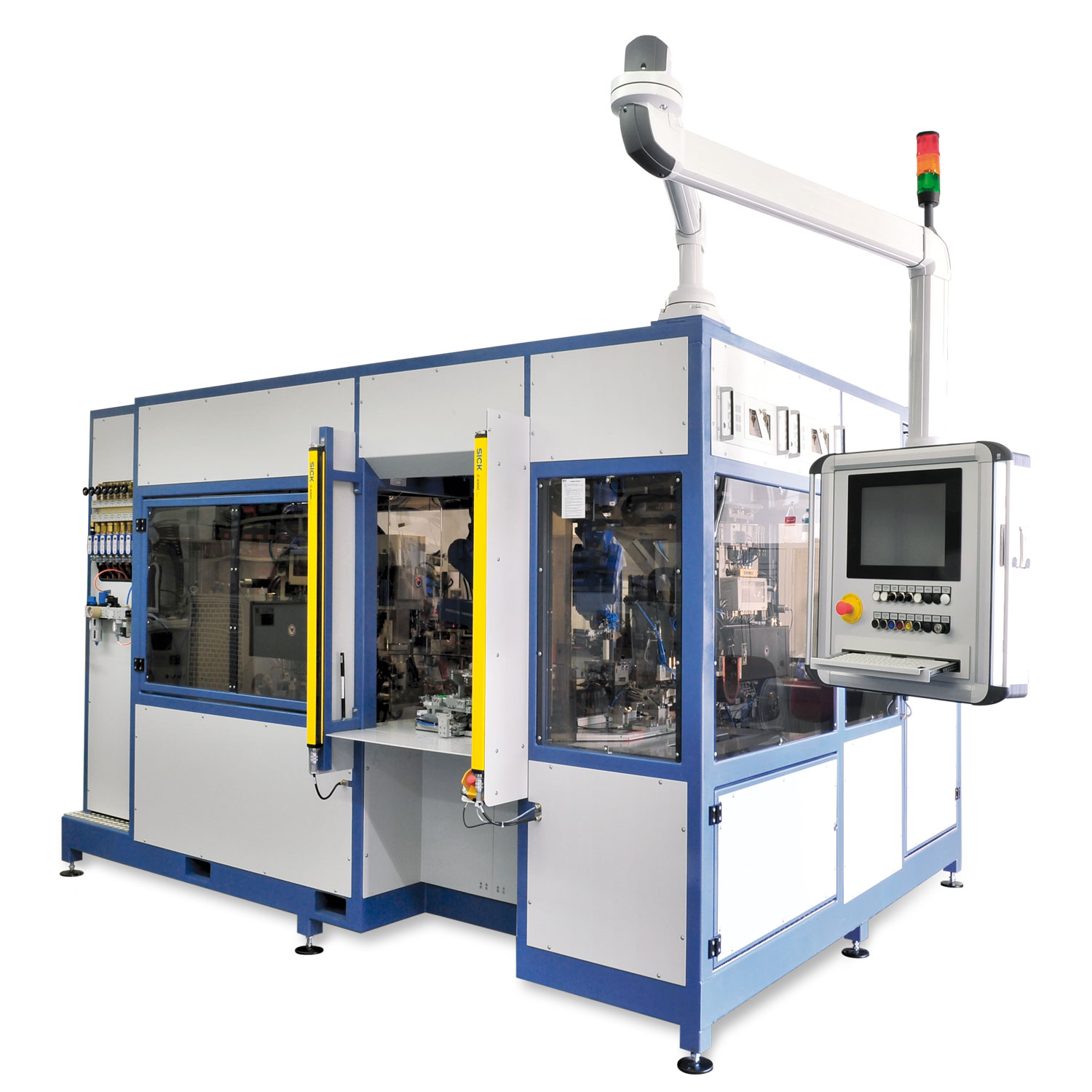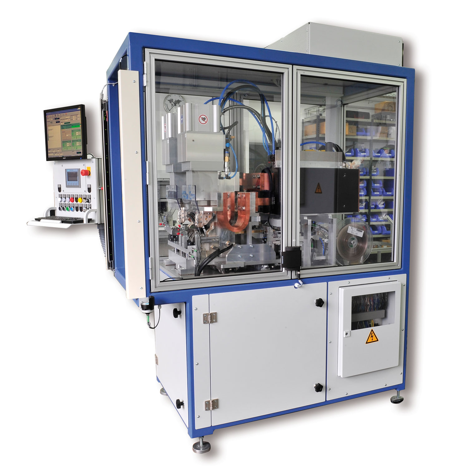 Automatische Anlage mit 4 servo gesteuertern Achsen sowie Werkzeug-Wechselsystem fĂĽr unterschiedliche Produkte. Die Anlage enthält eine STRUNK 1.000HZ Mittelfrequenz – SchweiĂźzange sowie die STRUNK SERVO Hartlotzufuhr fĂĽr die genaue Postionierung des Lot – Pads auf dem BusBar.