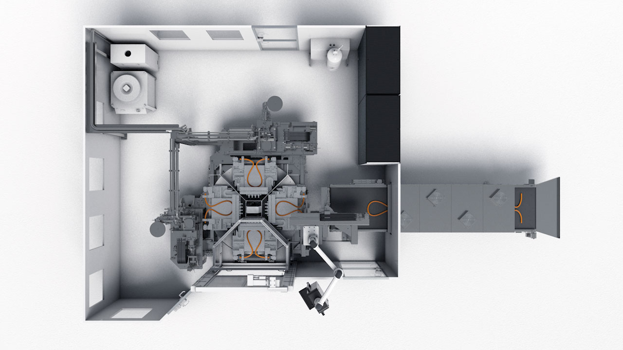 Fully automatic transfer line for compacting and punching as well as overlap welding or butt welding of braid strands and HV cable harnesses STRUNK length transfer for module connectors, adjustable to cable lengths from 150mm to 2000mm. Single and double cables possible. STRUNK INTELLIGENT CLAMPING SYSTEM also allows different cable lengths to be mapped in the connector. The cable ends are processed simultaneously on both sides. Output is to a conveyor belt, sorted or unsorted depending on further processing and automation strategy. The systems are reinforced for large-area compacting and connecting surfaces.